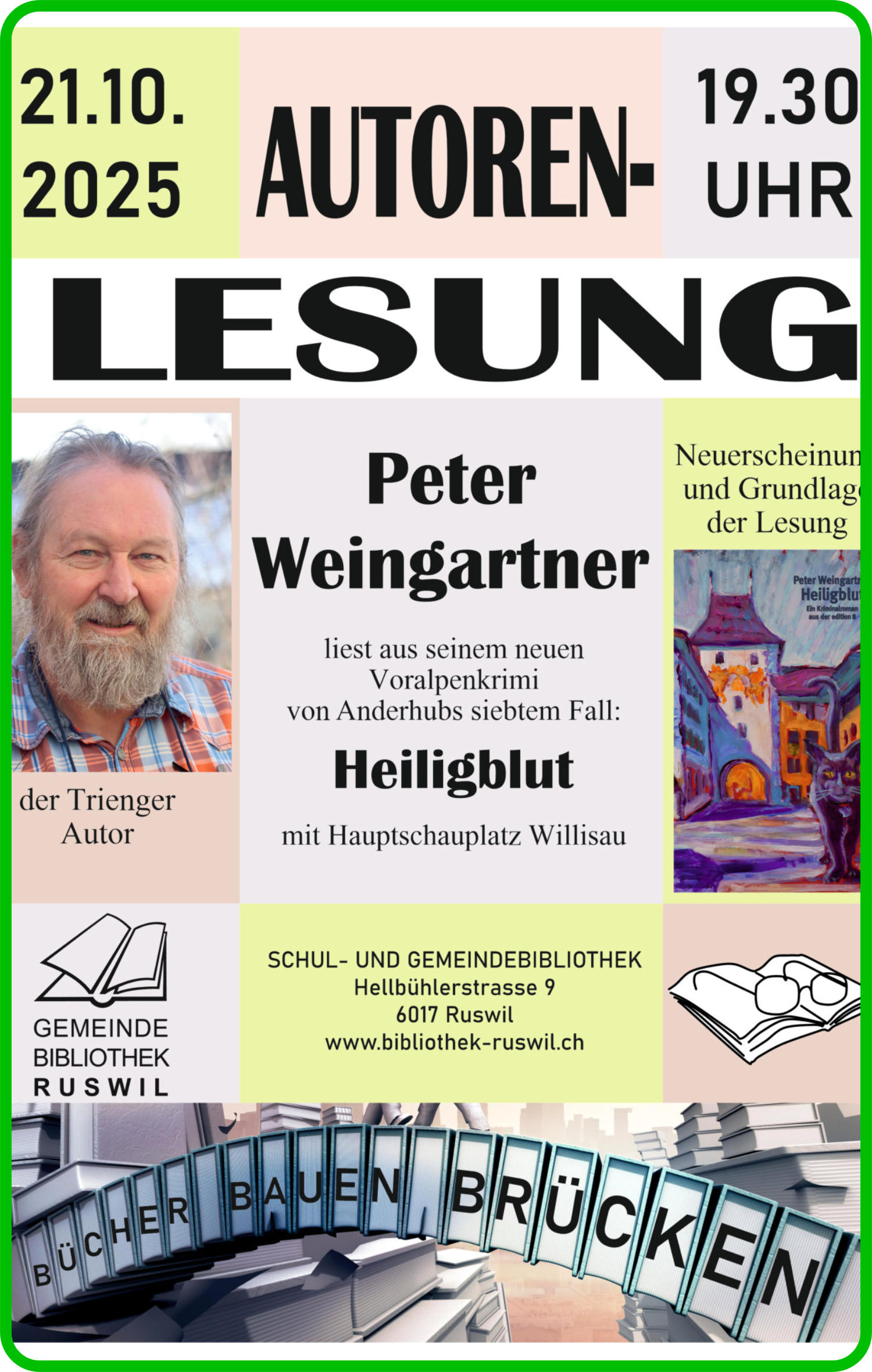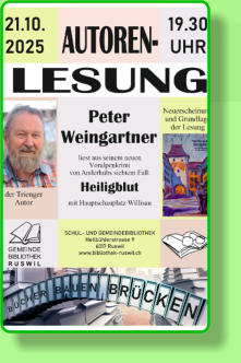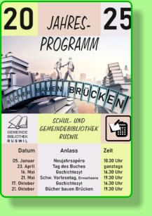 5. Januar10.30 UhrNeujahrsapero23. AprilTag des Buches16. Mai16.30 UhrGschechtezyt21. Mai19.30 UhrSchweizerischer Vorlesetagfür Erwachsene17. Oktober16.30 Uhr Gschechtezyt21. Oktober19.30 Uhr Bücher bauen BrückenWir freuen uns, Sie in der Bibliothek, auf unserer Webseite und via Rottaler frühzeitig über die Details zu informieren. Ihr Bibliotheksteam